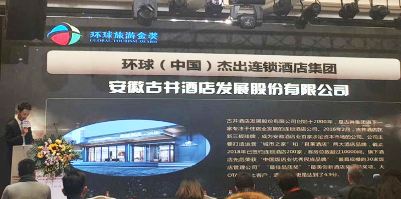 2018年11月28-29日,“第六届环球(中国)旅游投资论坛暨2018第六届环球(中国)旅游金奖颁奖典礼”在山东济南举行。古井酒店凭借现代化连锁酒店运营体系与中小酒店投资专业品牌服务商荣获2018环球(中国)杰出连锁酒店集团奖。