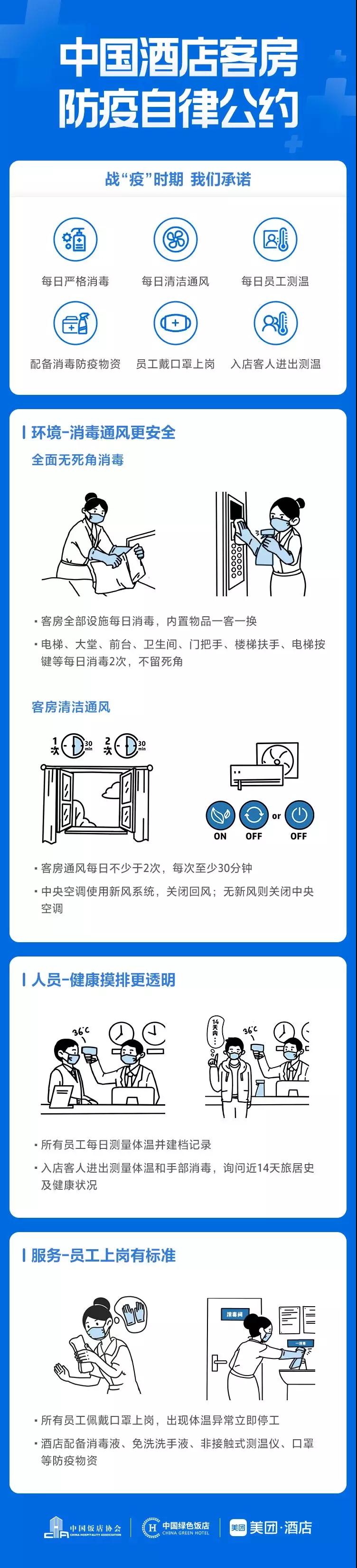加入《公约》后,所有人均可以通过美团APP查到酒店预订首页带有“安心住”的标签以及按照防疫标准每日开展的防疫清洁记录。后续门店复工后,也将同步遵照公约执行,让顾客可以放心预订,安心入住。