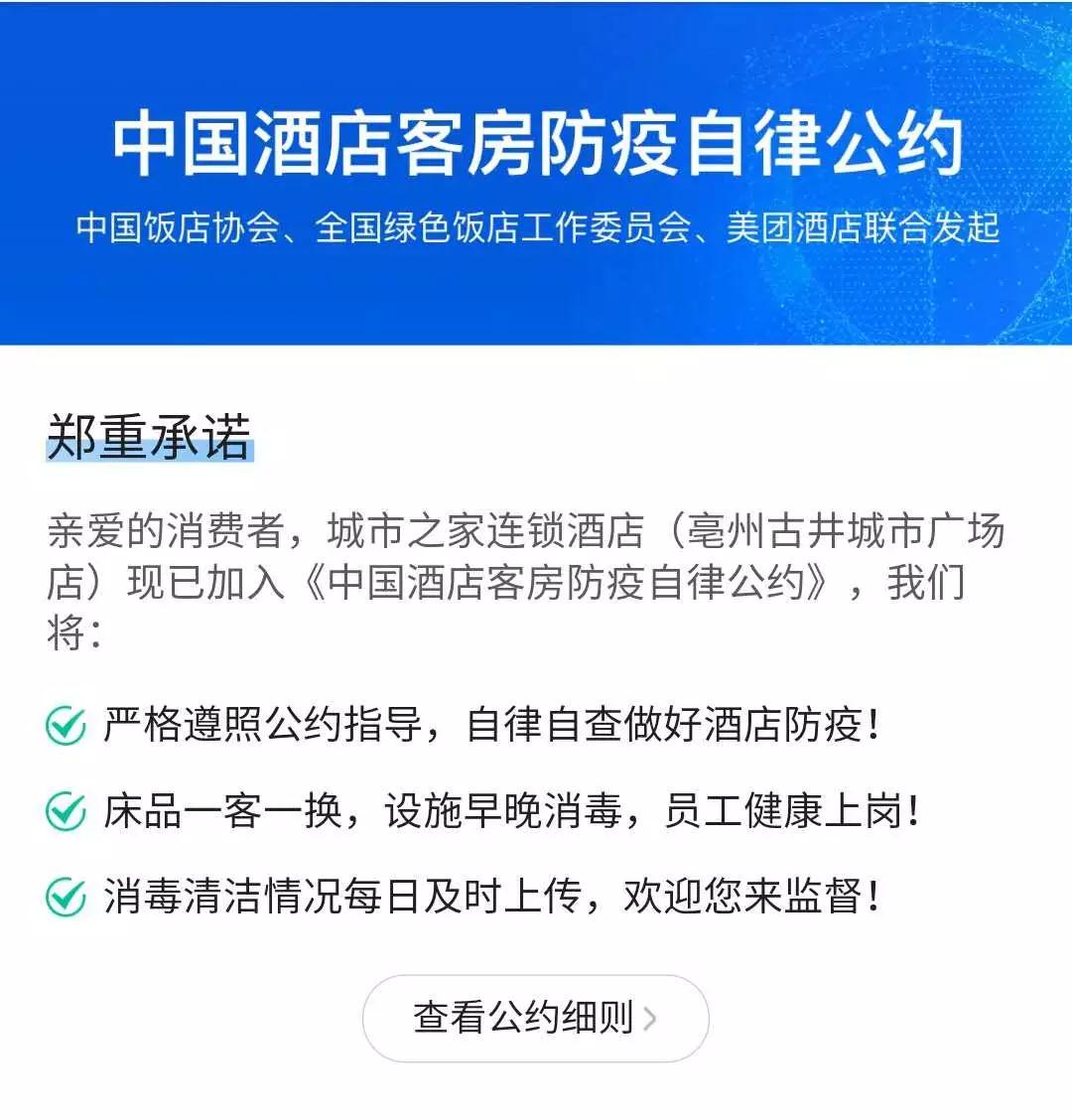 近日,古井酒店旗下疫情防控期间在营门店全部自愿申请加入由中国饭店协会、全国绿色饭店工作委员会、美团酒店联合发起的《中国酒店客房防疫自律公约》,严格遵照公约指导,自律自查做好酒店防疫,齐心协力,为顾客创造安全美好的住宿体验,为员工营造安全有保障的工作环境。