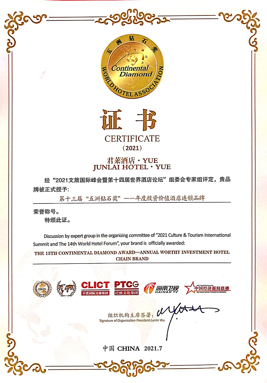 7月29-30日,“2021文旅国际峰会暨第十四届世界酒店论坛”大会在海口举办,现场进行了“五洲钻石奖”颁奖仪式。作为城市新中端生活方式酒店的代表,公司旗下“君莱酒店·YUE”品牌荣获“五洲钻石奖·年度投资价值酒店连锁品牌”。