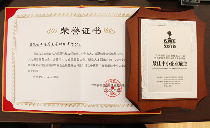 2020年4月,由安徽省人力资源和社会保障厅指导,新安人才网主办的“2019安徽企业最佳雇主评选”活动结果揭晓,古井酒店凭借卓越的品牌形象、完善的人才培养机制和优秀的企业文化连续两年荣获“安徽省最佳中小企业雇主”称号。