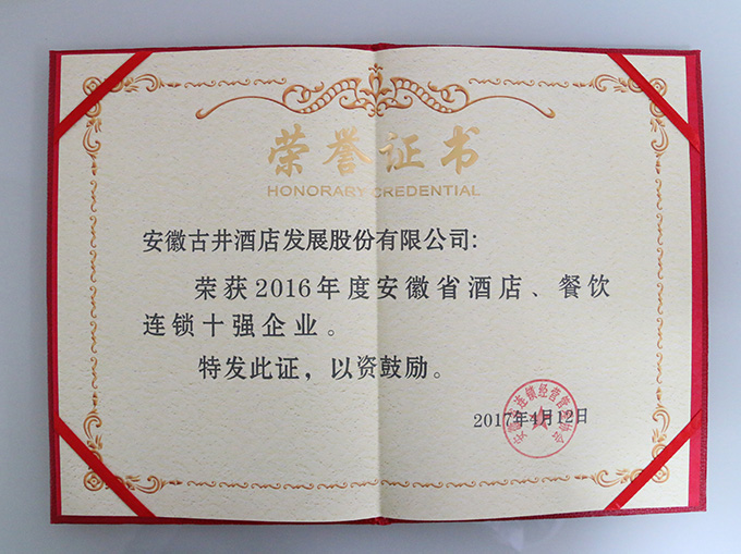 免费pg电子试玩软件获评“2016年度安徽省酒店、餐饮连锁十强企业”。
